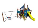 The slides are made from fibreglass. The surfaces of the slides, steps, etc. are made from high quality HDPE plastic (high density coloured polyethylene, which is characterised by high colour stability, UV resistance but mainly safety as it doesn't break and therefore there is no danger of injury to children by sharp fragments). The ropes and nets are made using HERKULES material (16 mm thick ropes made from polypropylene with a steel internal core) and are connected with plastic or aluminium joints. The platforms and the drawing board are made from HPL (High-pressure laminate, which is characterised by high colour stability and water resistance).The swing is hung on a metal beam using galvanized chains. The "Bird's Nest" seat is made from polypropylene rope with heavy duty fibres. The hanging ropes are made using HERKULES material (16 mm thick ropes made from polypropylene with a steel internal core). All fastening material is galvanized or stainless steel.