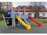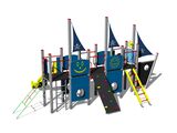 5x tower, 2x slide, metal railing set in a metal frame, 3x post with a flag, drawing board, sloping net access, sloping climbing wall with climbing holds, sloping ramp with the rope and HDPE steps, sloping ladder with metal steps, 4x barrier with an aperture, ladder, anchor, helm made from HDPE, 4x barrier from HDPE. More information