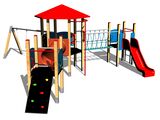 The slide is made from fibreglass. The surfaces of the slides, steps, etc. are made from high quality HDPE plastic (high density coloured polyethylene, which is characterised by high colour stability, UV resistance but mainly safety as it doesn't break and therefore there is no danger of injury to children by sharp fragments). The rope bridge is made using HERKULES material (16 mm thick ropes made from polypropylene with a steel internal core) and is connected with plastic or aluminium joints. The platforms and the sloping climbing wall are made from HPL (High-pressure laminate, which is characterised by high colour stability and water resistance). The climbing holds are made from the mix of silica sand and epoxy resin, which ensures long life, colour preservation as well as skin friendly surface. The crawler tunnel is made of laminate. All fastening material is galvanized or stainless steel.