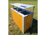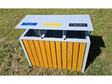 The waste bin for sorted waste is made from spruce wood. The wood is impregnated and coated with a layer of lacquer. The structure is fixed in a concrete bed. The trash can insert is made of galvanized steel. All other metallic elements are duplex powder coated with coat curing according to RAL to prevent corrosion. All fastening material is galvanized or stainless steel.